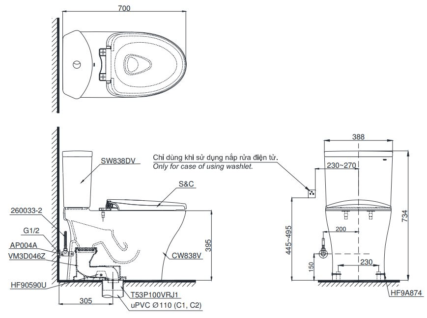 - 02 chế độ rửa trước, rửa sau massage linh hoạt, điều chỉnh vị trí vòi rửa